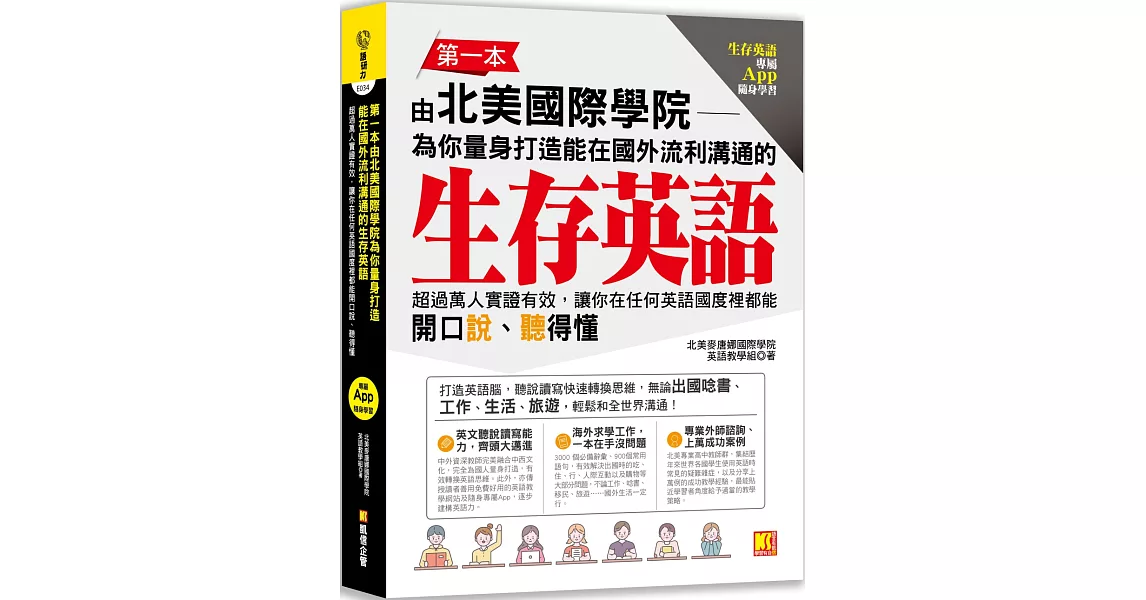 博客來-第一本由北美國際學院為你量身打造能在國外流利溝通的生存英語:超過萬人實證有效,讓你在任何英語國度裡都能開口說、聽得懂(生存英語專屬App隨身學習)訂購網址: https://www.books.com.tw/exep/assp.php/87926/products/0010845164?utm_source=87926&utm_medium=ap-books&utm_content=recommend&utm_campaign=ap-202010